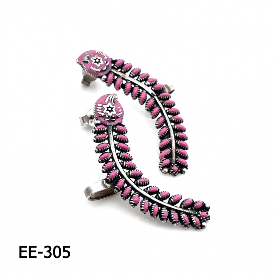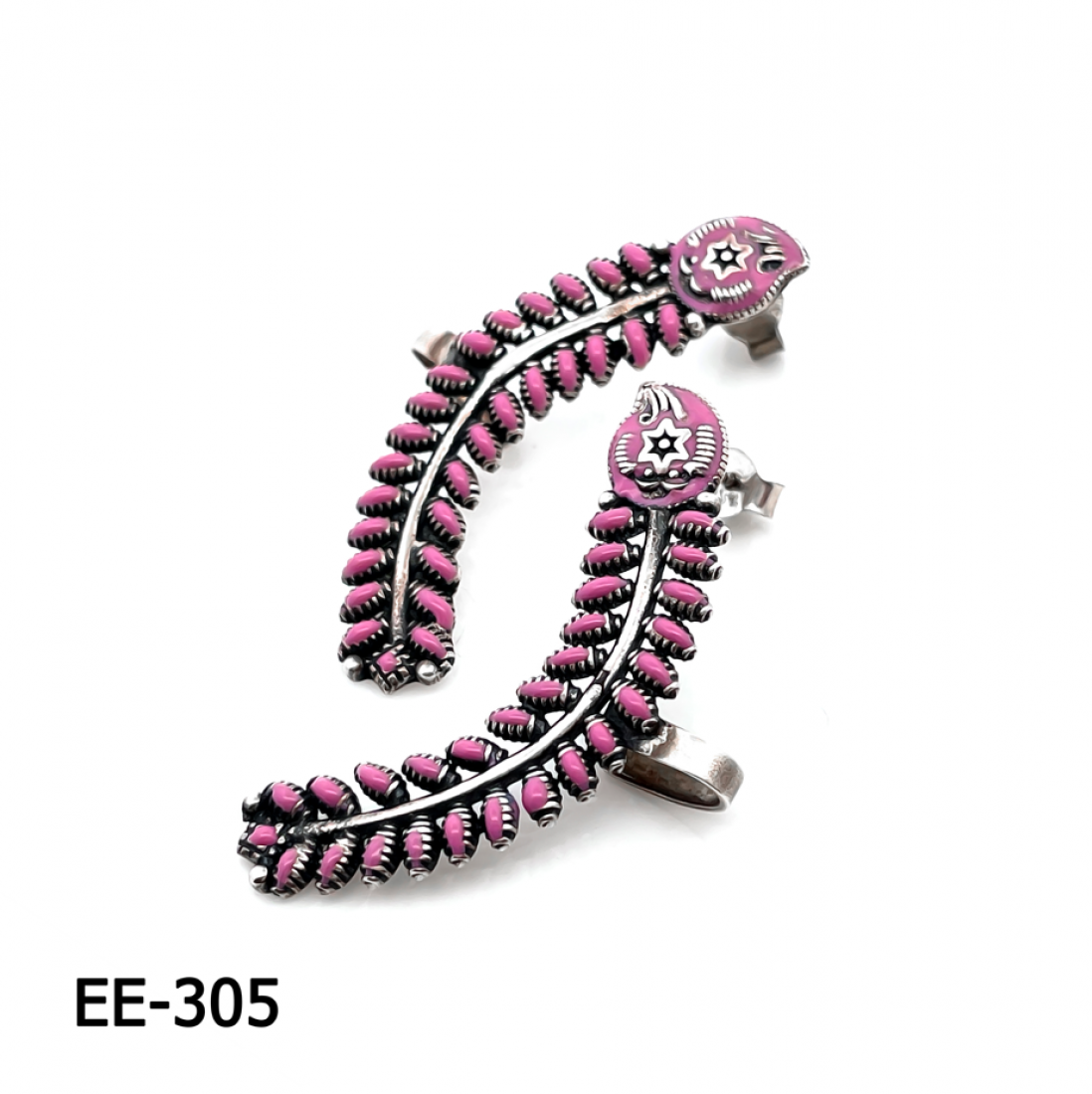 Pink Enamel Leaf Curve Ear Cuff Earrings – 925 Sterling Silver Climber Design with Embossed Star Detail